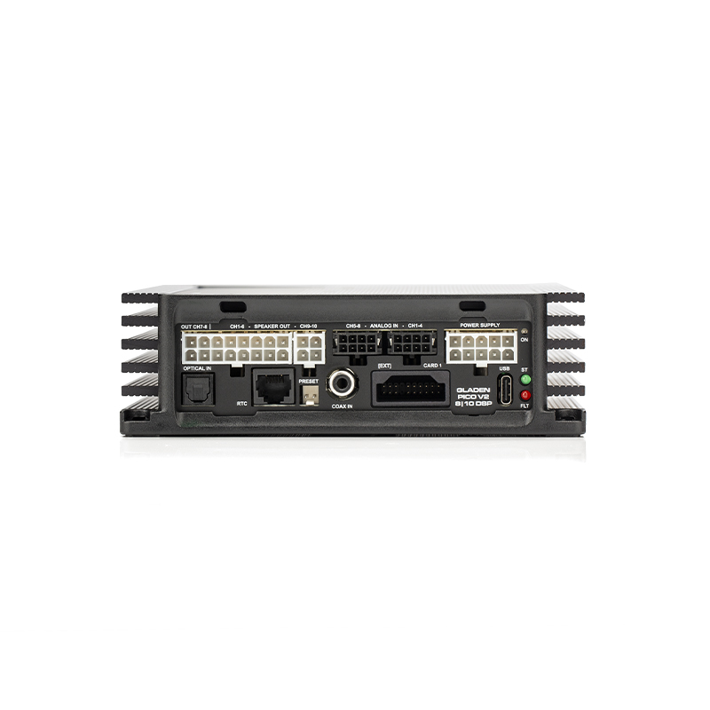 With the PICO V2 8|10 DSP, MOSCONI is launching the second generation of PICO DSP amplifiers on the car hi-fi market. In addition to improved connectivity, the new PICO scores with increased sound performance and better efficiency. All connections are now located on one side and all relevant setting switches required for operation in modern vehicles are located under a magnetic housing cover. Furthermore, all inputs are now high- and low-level capable. All desired DSP settings can now be made via a USB-C connection.