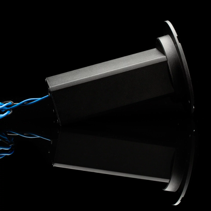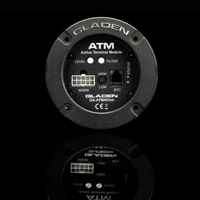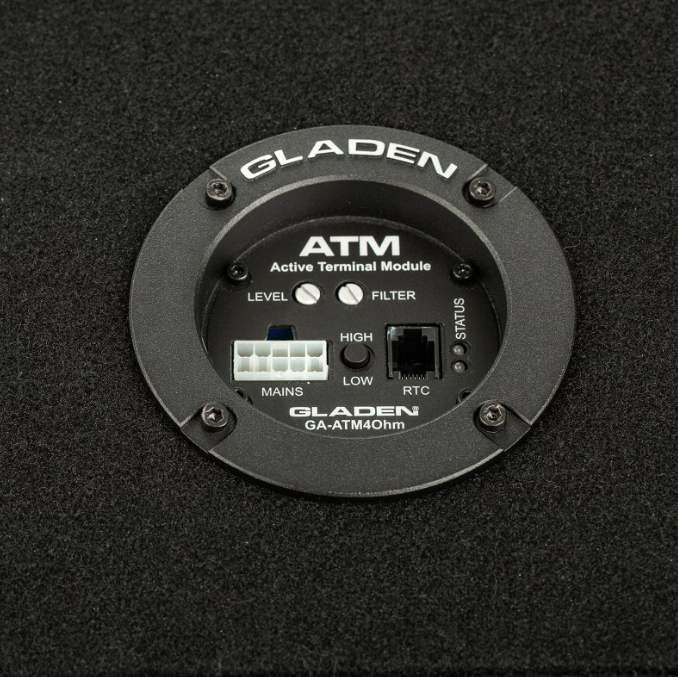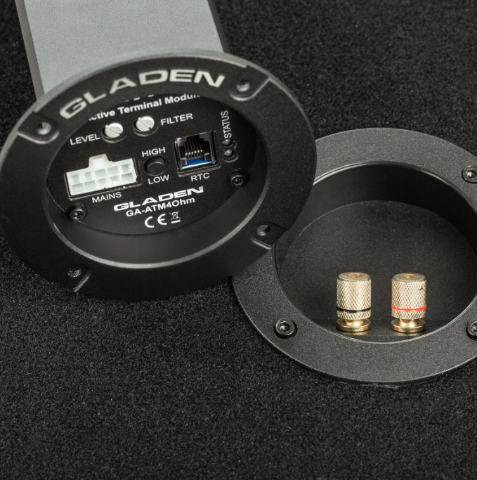 The Gladen ATM 2/4 module can be exchanged for a 78 mm round terminal of a subwoofer cabinet due to its round design.