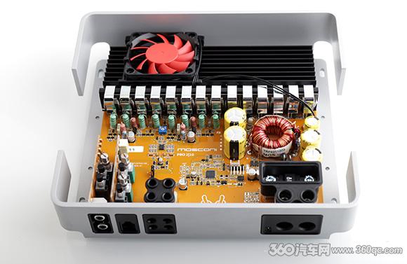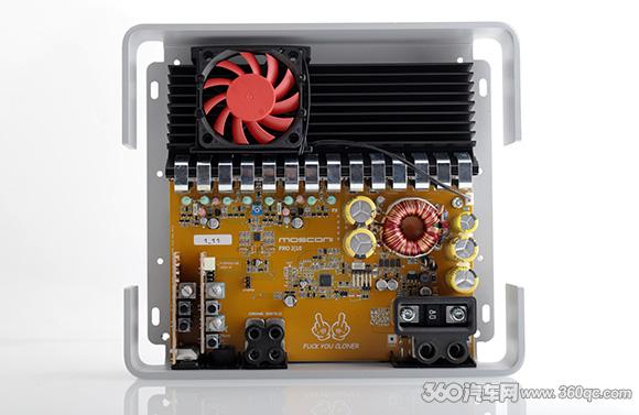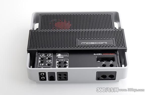 从PRO 2|10的设计,我们可以看出承继着MOSCONI PRO系列功放设计上的传统,已经为消费者打造出个性鲜明的舞仕刚柔参考级功放设计元素。沿用银色压铸铝框架+四圆角设计,上方2/3空间是冲压铁网保护内部电路和金属散热片,透过密布的网格可以隐约看到代表性的内部红色冷却风扇,典型的意大利式工业设计风。下方的1/3部分是PRO系列另一大特色磁吸盖板,隐藏盖板之下是前级调控面板和安装接线紧固孔。外形上分辨PRO系列四款型号,最直观就是尺寸,全系列产品采用统一的宽度和厚度,路数最多的五声道PRO 5|30最长为500mm,其余四声道、两声道和单声道三款产品,则是采用同样的235mm长×205mm宽×55mm高规格。