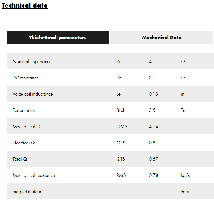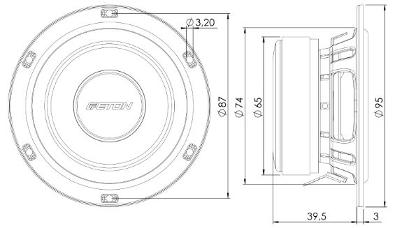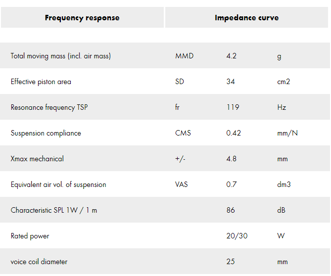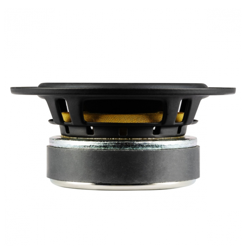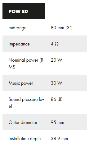 80 mm (3") multilayer paper-fiberglass fabric cone with special coating, powder-coated & stiffened metal basket with ventilation holes. High quality 2.8 / 4.8 mm connector plug terminals. CNC over-turned T-joke with large core bore for best possible ventilation without flow noise. Soft cover dome for tonal neutrality. 4 ohms impedance, rated / music power handling: 20 / 30 W. Outer diameter 95 mm, cut-out diameter 74 mm, installation depth 38.9 mm. Incl. speaker cover grille with rings and mounting accessories. Manufacture and development Made in Germany.