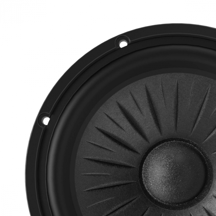 High-end 165 mm (6.5 inch) woofer/midrange with ribbed, stiffened paper cone, hand-painted fabric dust cap and symmetrical stranding with voice coil ventilation. Extremely torsion-resistant die-cast aluminum basket with optimized ventilation and strong neodymium magnet, 4 ohm impedance, 90 W RMS rated power handling, 140 W music power handling, 88 dB characteristic sound pressure, Made in Germany manufacturing and development.