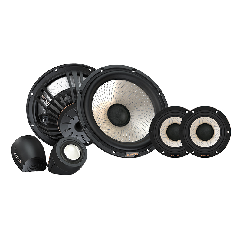 165 mm (6.5 inch) 3-way high-end system with magnesium composite cone, flow-optimized aluminum die-cast basket and basket design, powerful neodymium magnet, hand-coated fabric dust cap, 28 mm magnesium keronite tweeter with hand-coated surround, multi-vented, with asymmetric coupling volume and RCFS technology. 80 mm (3 inch) magnesium composite cone midrange driver with powerful neodymium magnet, reinforced die-cast aluminum basket, resonant frequency 1W/TSP: 57/59 Hz, characteristic sound pressure 88 dB, rated power handling: 100 W RMS, 4 Ohm Impeadnz, incl. CNC-machined, sandblasted aluminum surface-mount and built-in enclosures, black anodized, removable tweeter grilles. Manufacturing and development Made in Germany.