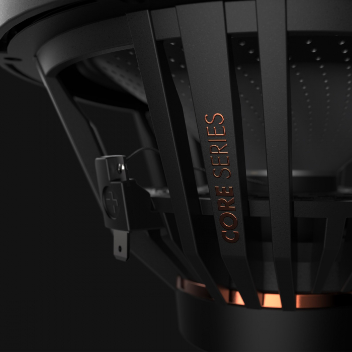 我们的“核心”——最优质的材料与独特的设计相结合。一切都在这里简单明了!CORE系统以其革命性的膜技术令人印象深刻,该技术由多孔镁复合膜组成。该膜以极其复杂的工艺穿孔,并覆盖一层烯烃膜。这些穿孔与跨越的烯烃膜一起形成精细的气泡状凸起,其作用就像小的局部振动阻尼器,从而阻止任何模态的发展。结果是具有温暖声音特征的出色音调平衡。精心设计、流线优化的压铸铝篮设计,赋予了系统前所未有的独特性格。